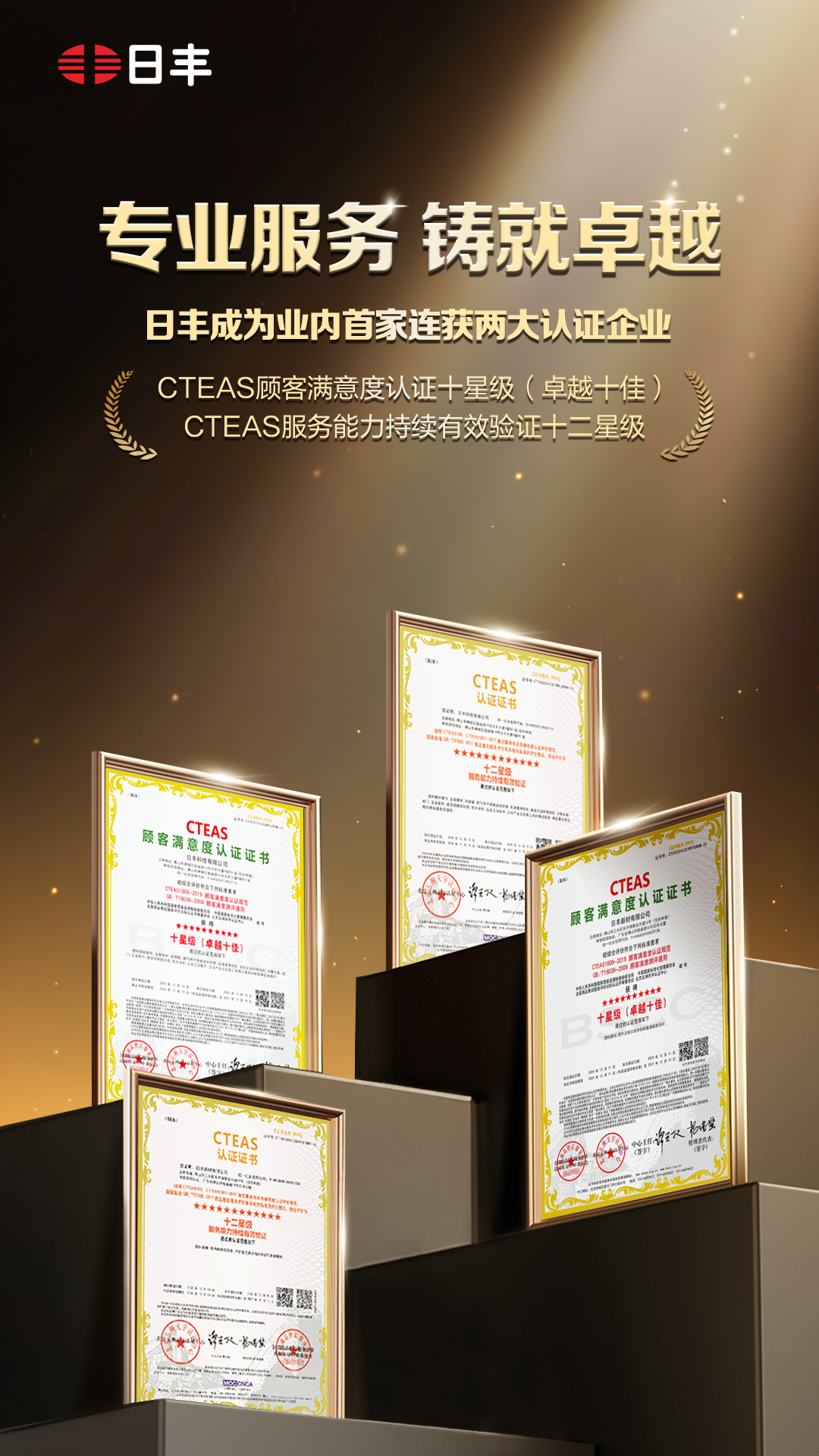 行业首家!国标认可!日丰荣获CTEAS顾客满意度认证十星级(卓越十佳)及CTEAS服务能力持续有效验证十二星级